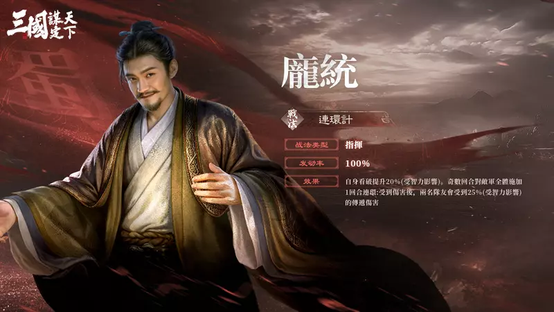 龐統,東漢末年傑出的謀略家,與諸葛亮並稱為「臥龍鳳雛」,共同鑄就了三國時期蜀漢政權的輝煌篇章。龐統自帶戰法「連環計」能提升自身看破,且可以造成敵軍受到傷害時其兩名隊友也會受到傳遞傷害。