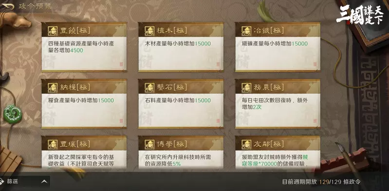 政令的選擇對主公尤為重要。進入政令群策介面後,可以看到三個隨機生成的政令提案,從中選擇一個來採納其效果。每當提案刷新時,都有機會重新隨機獲得新的選項,只需點擊刷新按鈕即可。一旦做出選擇,當前的政令將無法更換,直到下一次刷新時才能進行新的選擇。
