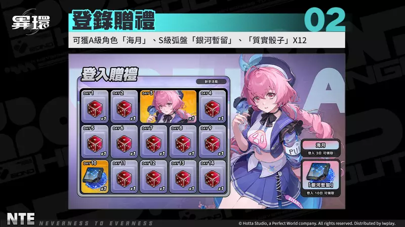 - 14天登入獎勵:完成每日登入即可獲得A級角色「海月」、S級弧盤「銀河暫留」、質實骰子 X12