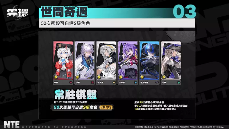 - 世間奇遇:於常駐棋盤累積抽取達50次,可自選六位S級角色之一(早霧、白藏、哈索爾、法帝婭、達芙蒂爾、九原)
