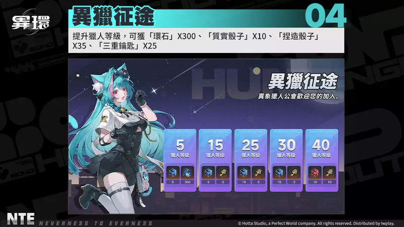 - 異獵征途:隨著獵人等級提升,即可獲得環石 X300、質實骰子 X10、捏造骰子 X35、三重鑰匙 X25