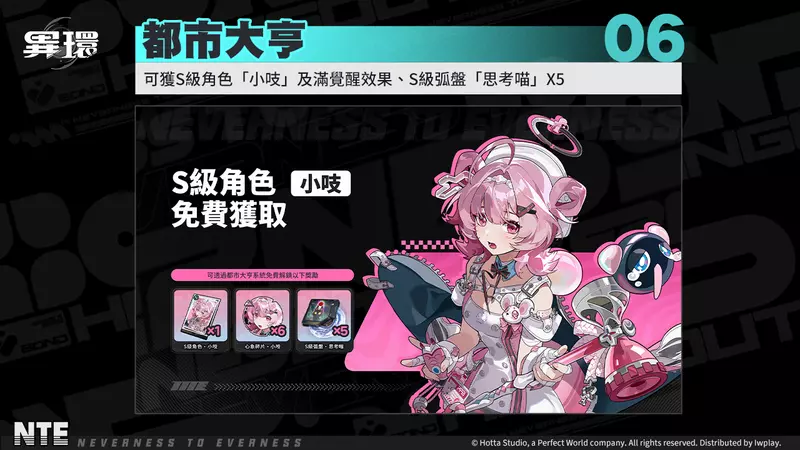 - 都市大亨:提升都市大亨至指定等級,可免費解鎖S級角色「小吱」及滿覺醒效果、並可獲得S級弧盤「思考喵」X5